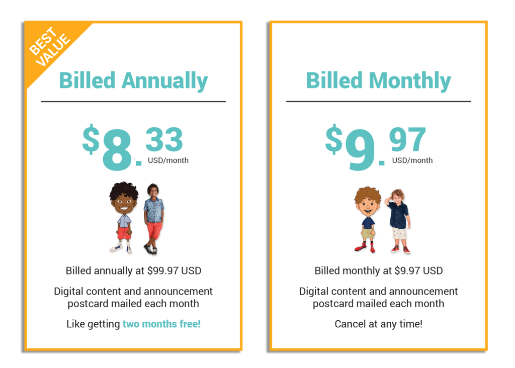 CelebrateMe Stories is a monthly subscription service which includes both the digital story featuring your child as the main character; and also a monthly postcard that arrives a few days before your next monthly story.  This Postcard announces the story for the next month, getting your child excited about what they are about to experience!